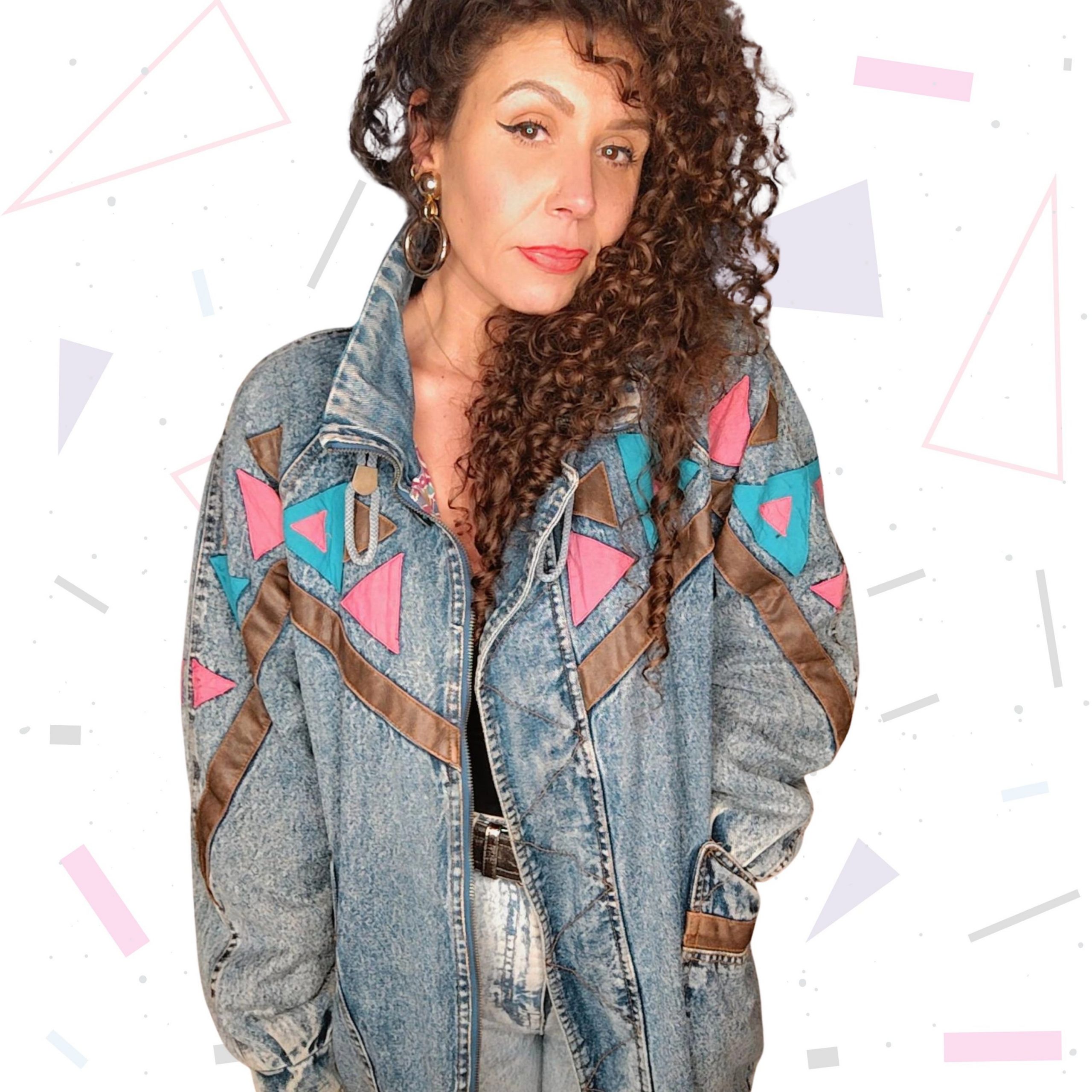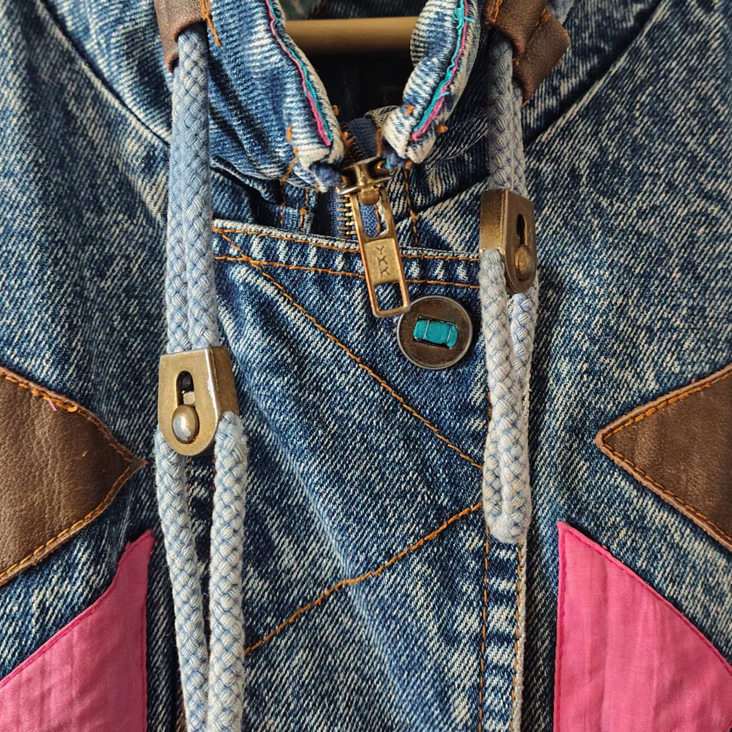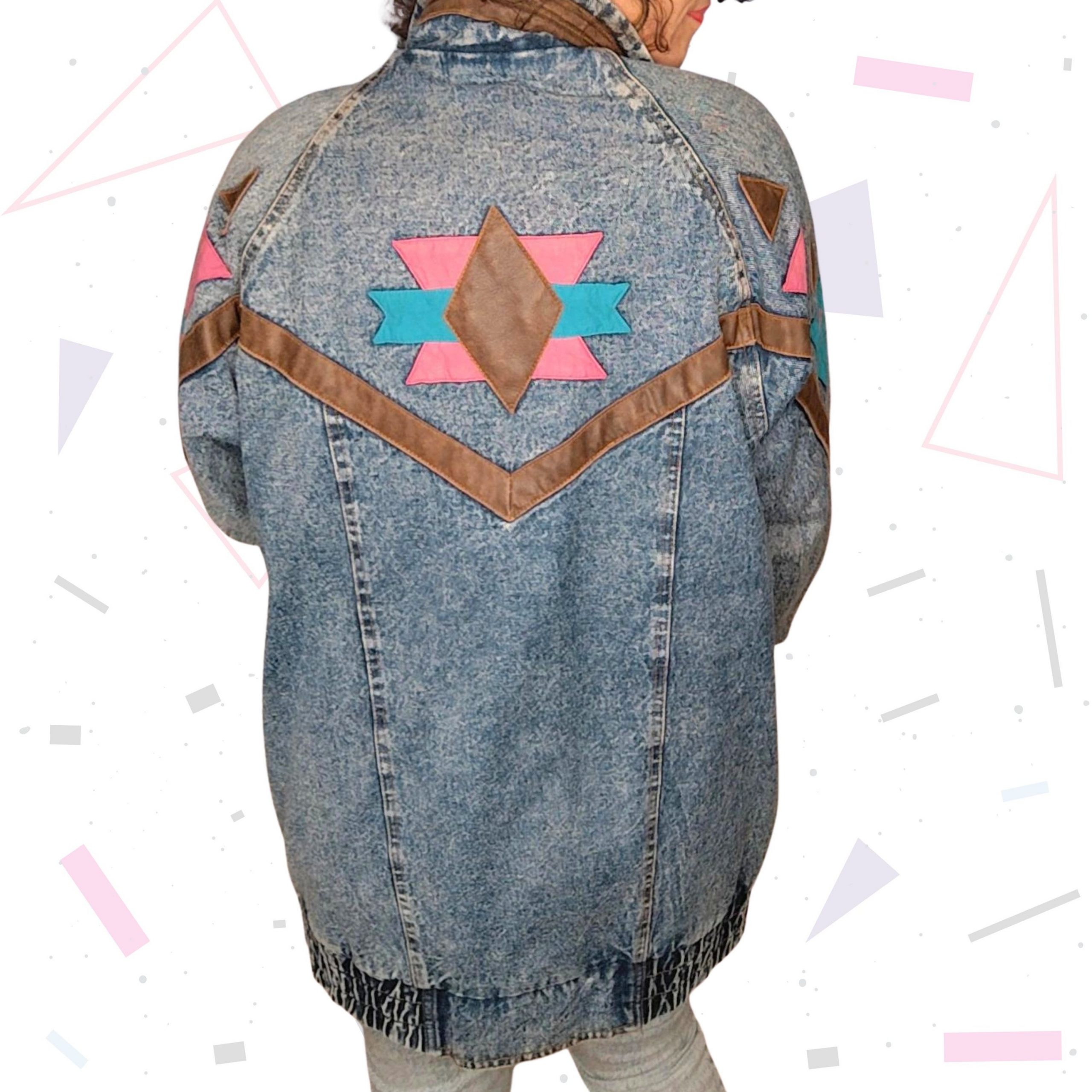 Straight out of the 80s, this is a longline acid wash lined denim bomber jacket, featuring accents in pink and blue and brown leather. With pockets and shoulder pads. The jacket has an 80s slightly worn aesthetic and is overall in very good condition. See all photo’s before purchasing.