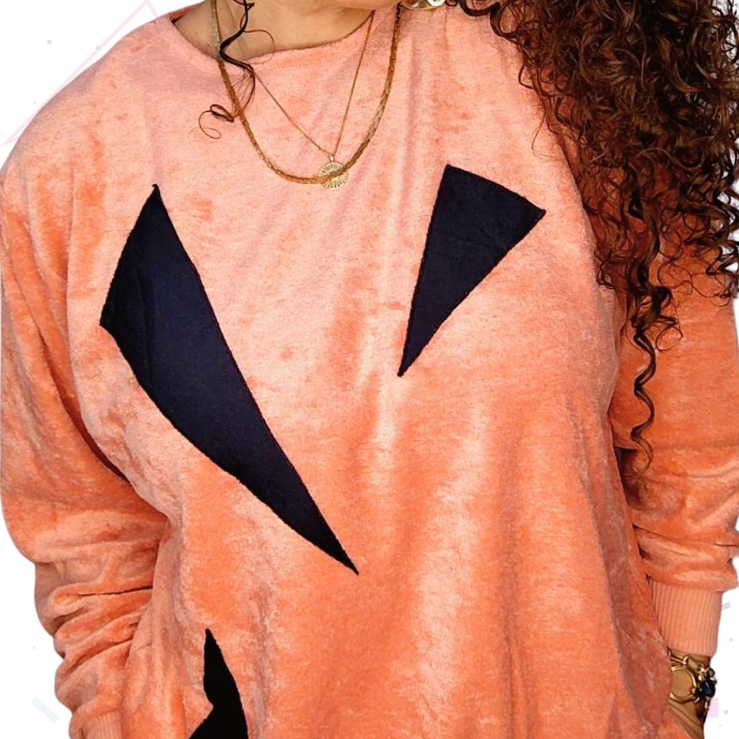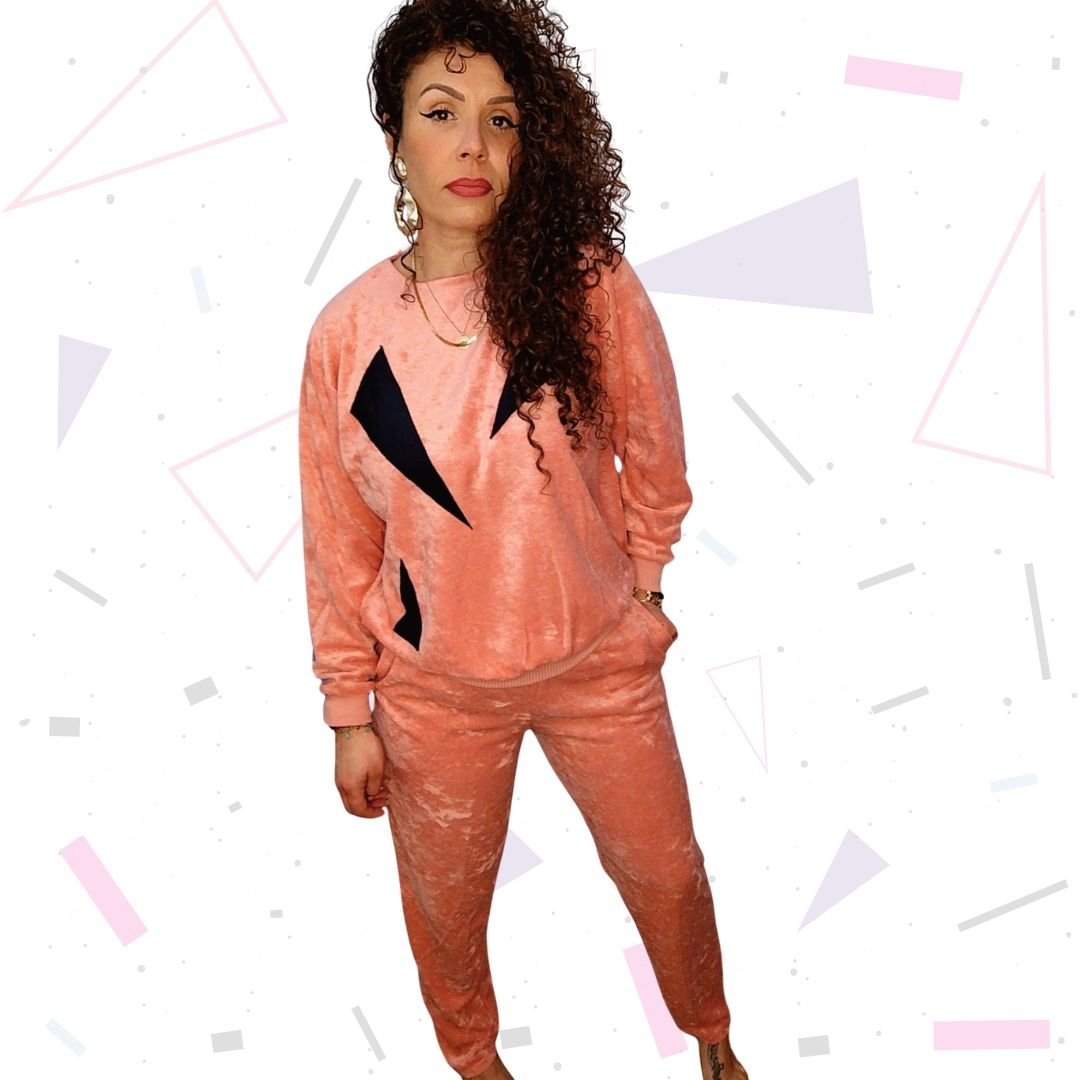 Brand new vintage. Coral pink velour Loungewear set with black geometric patchwork detail. Trousers are straight leg, with pockets. Elasticated waistband.