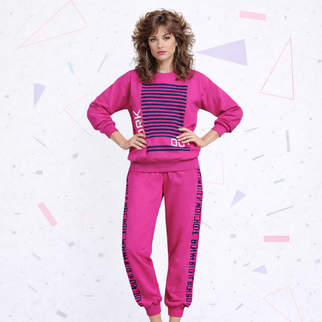 Details: Hot Pink, fleeced inner, cuffed ankles, dark blue stripes/text