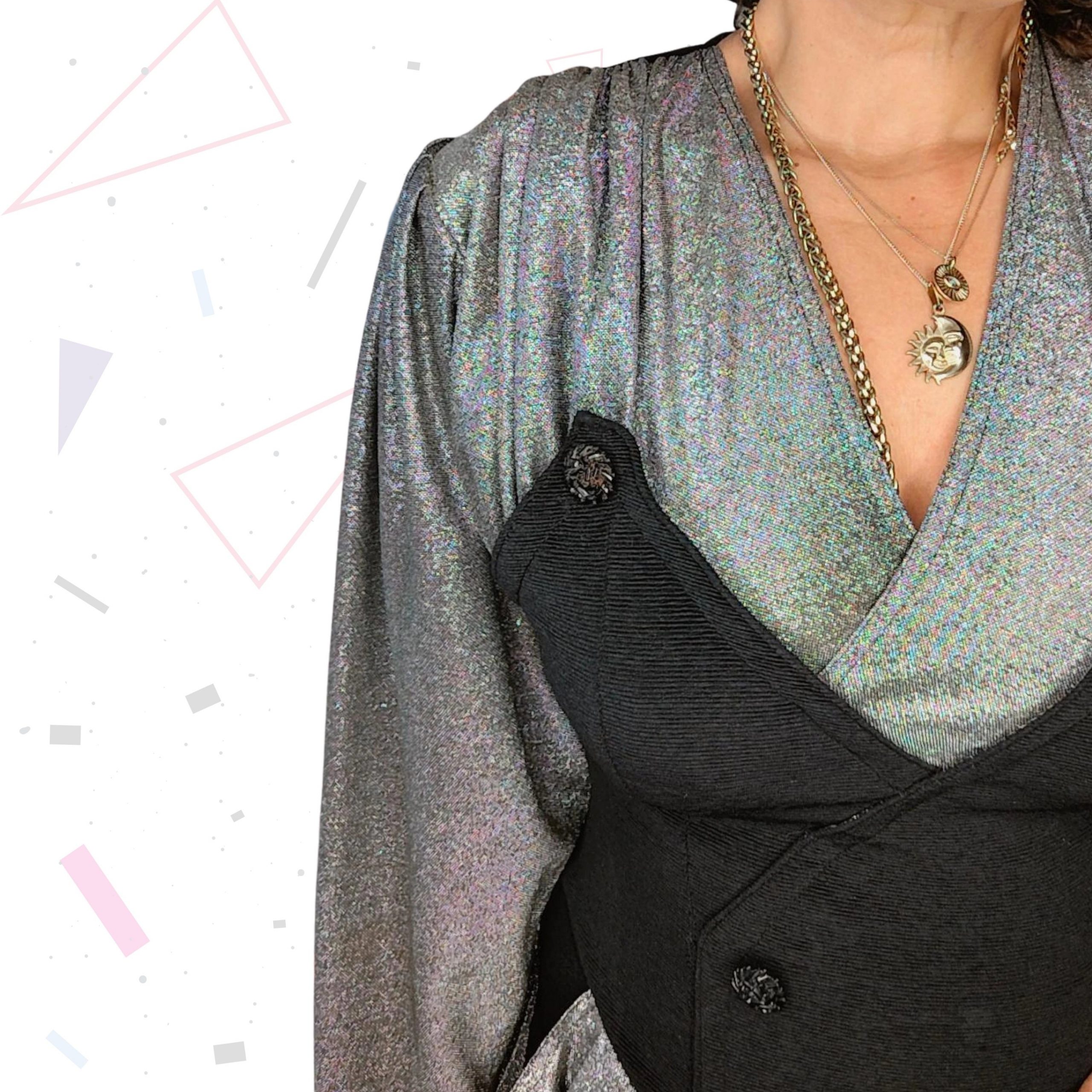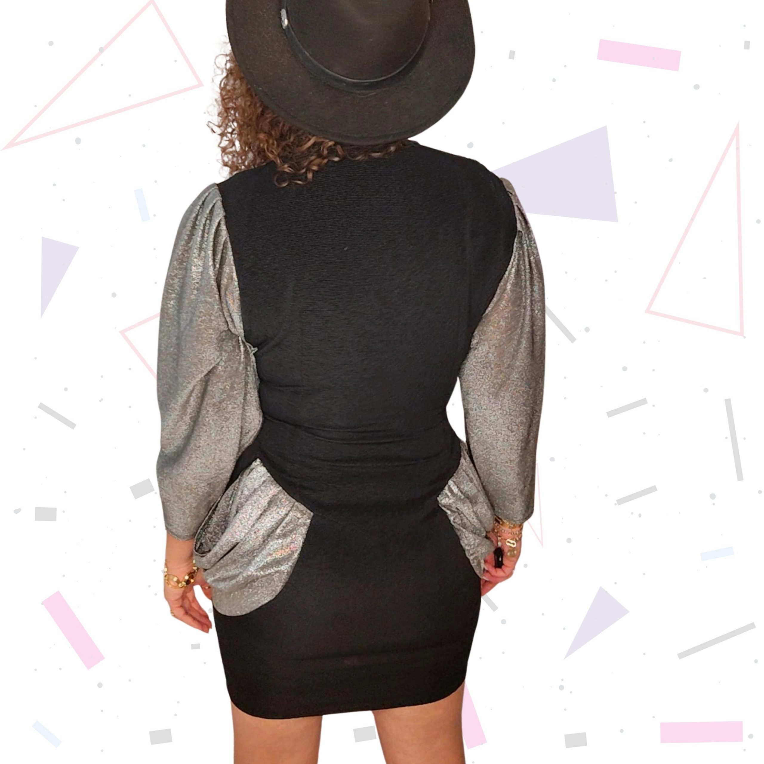 80s black stretch mini dress with lurex light gold contrasting fabric. Black parts of the dress are ribbed fabric.