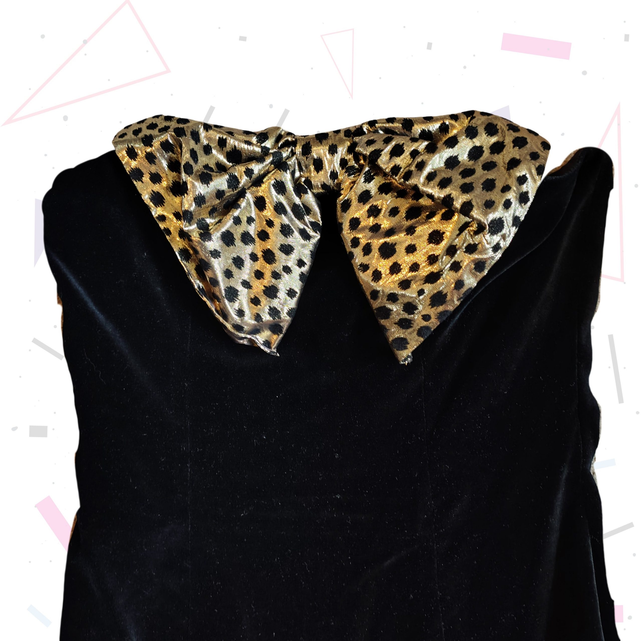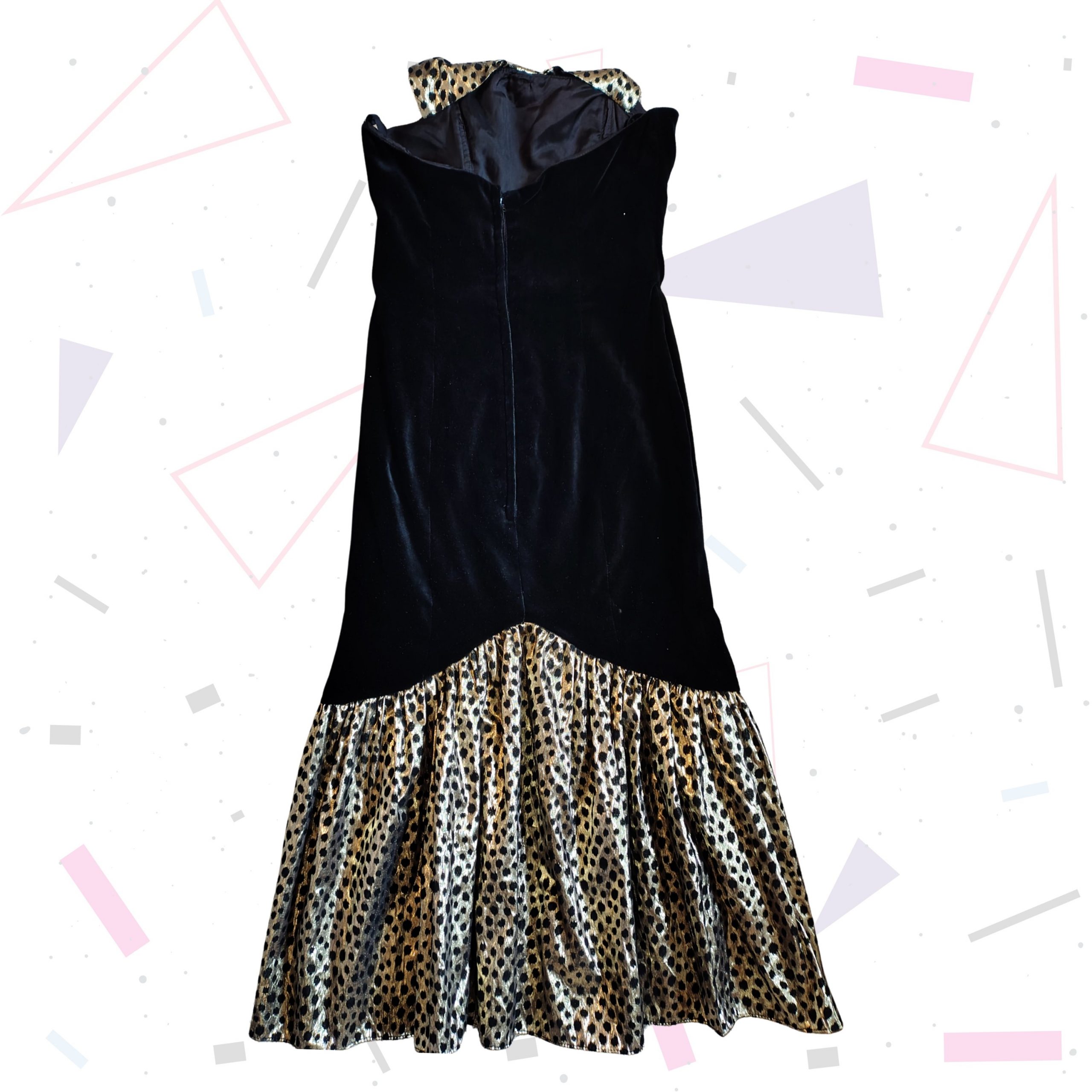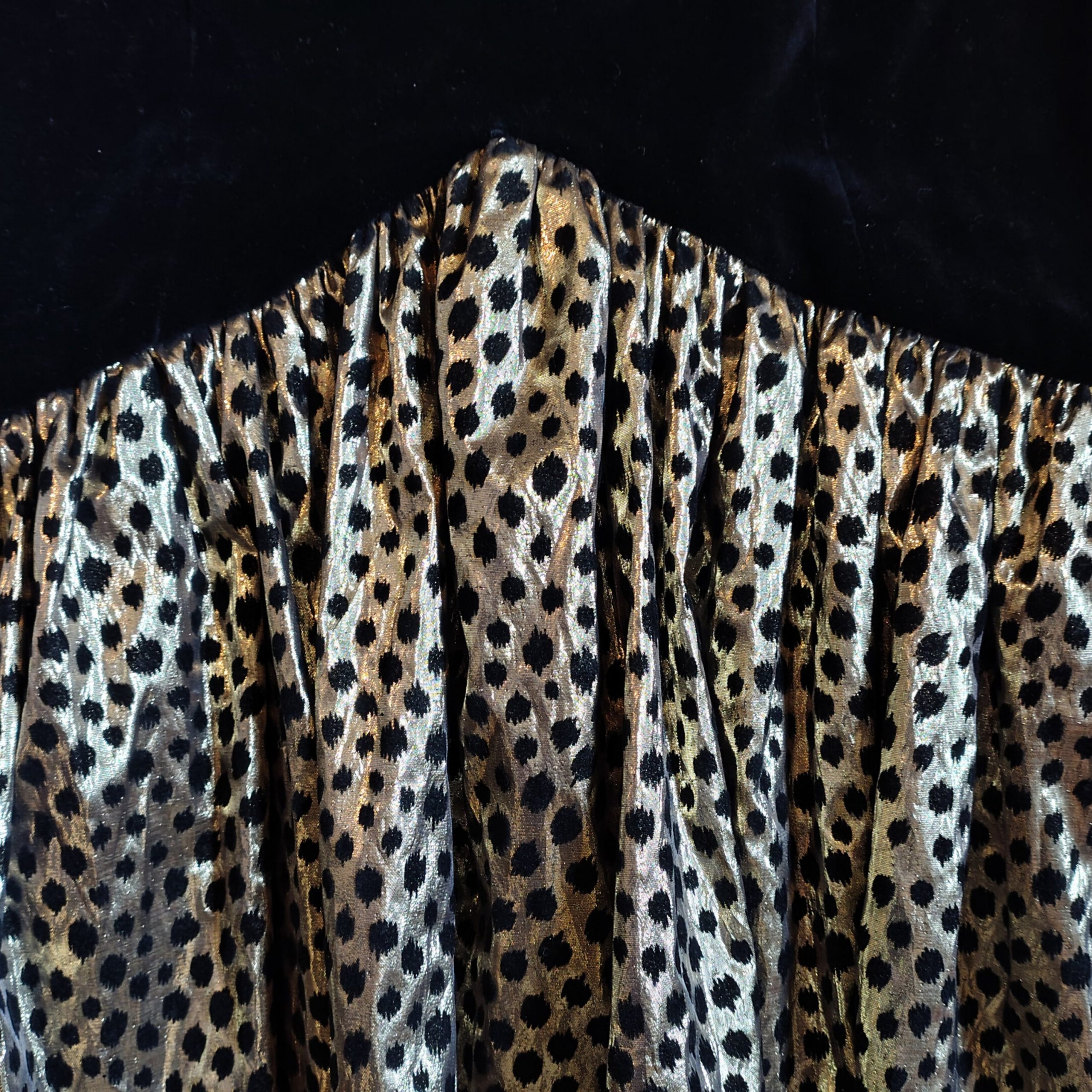 Details: Black velvet, with gold and black polka dot ruffle bottom. Fitted shape. Back zipper fastening