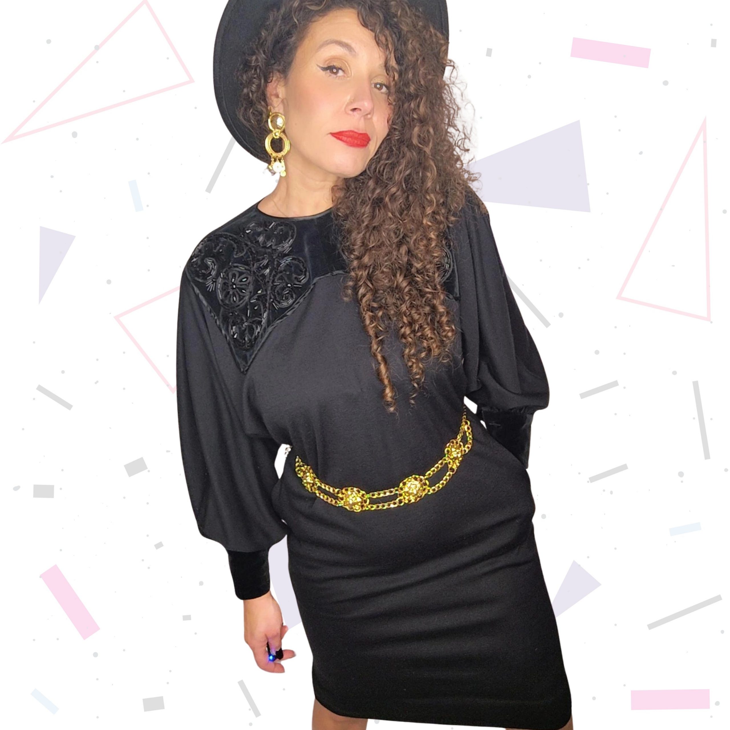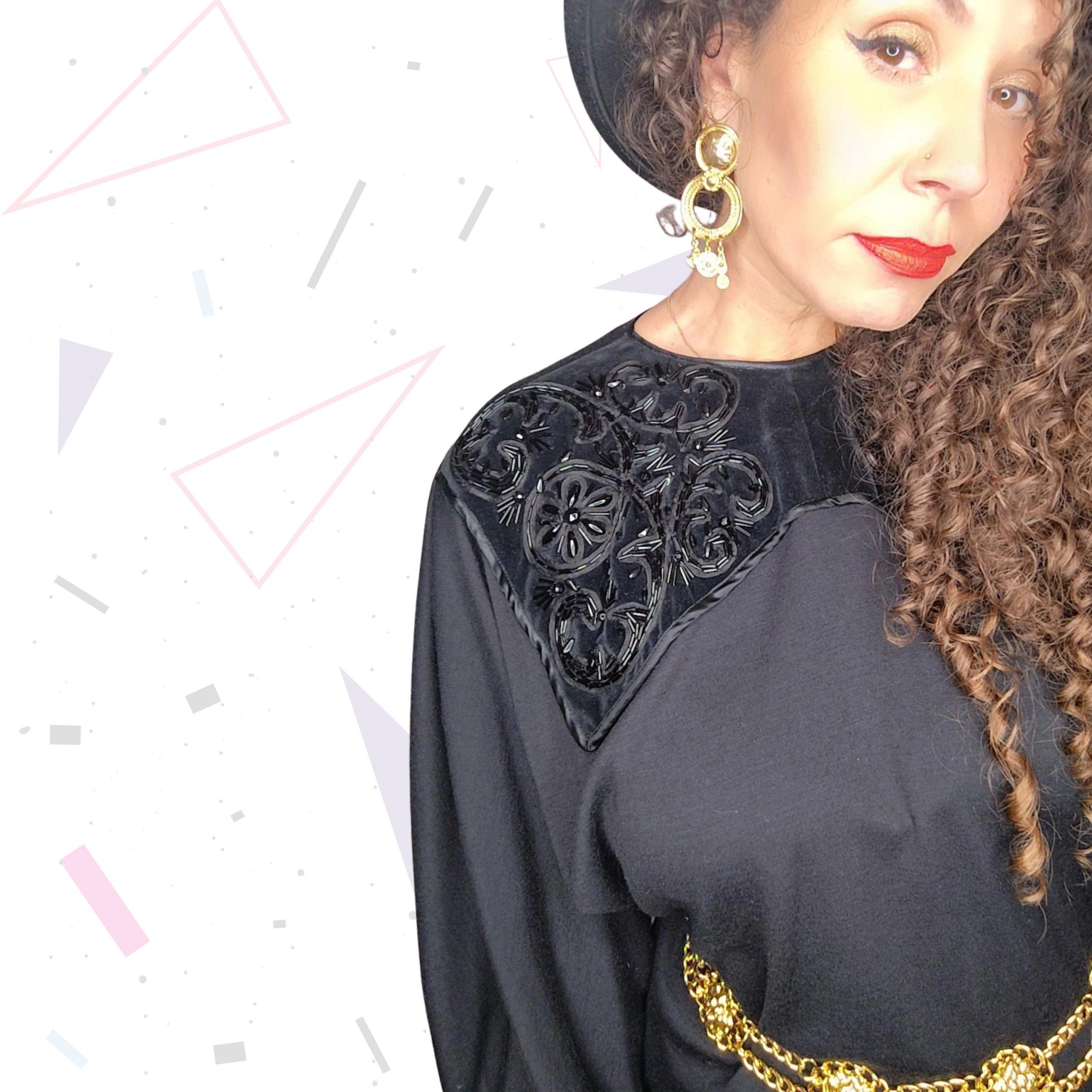 Circa 1980s, black batwing sleeve dress with pockets. Featuring velvet to the cuffs and chest area and beading detail to the chest also.
