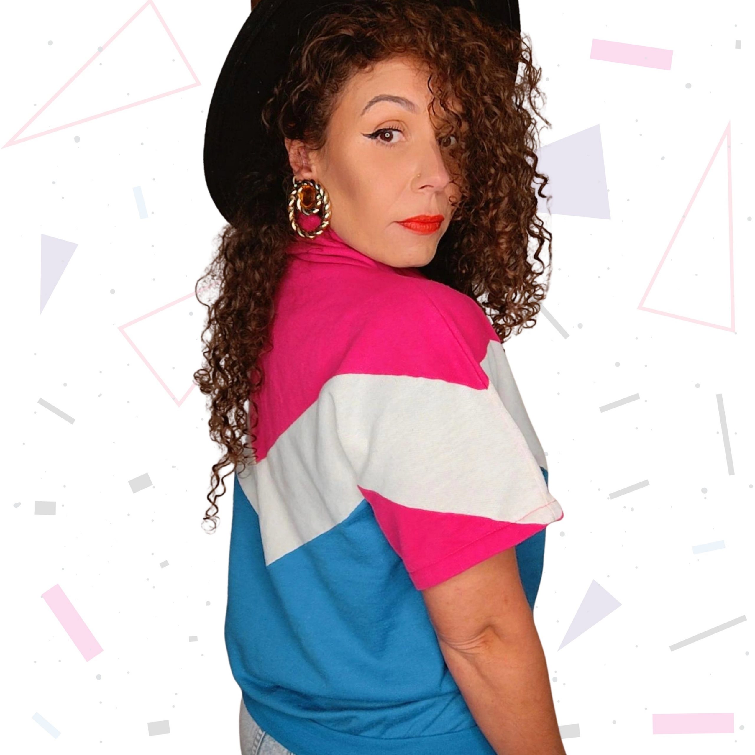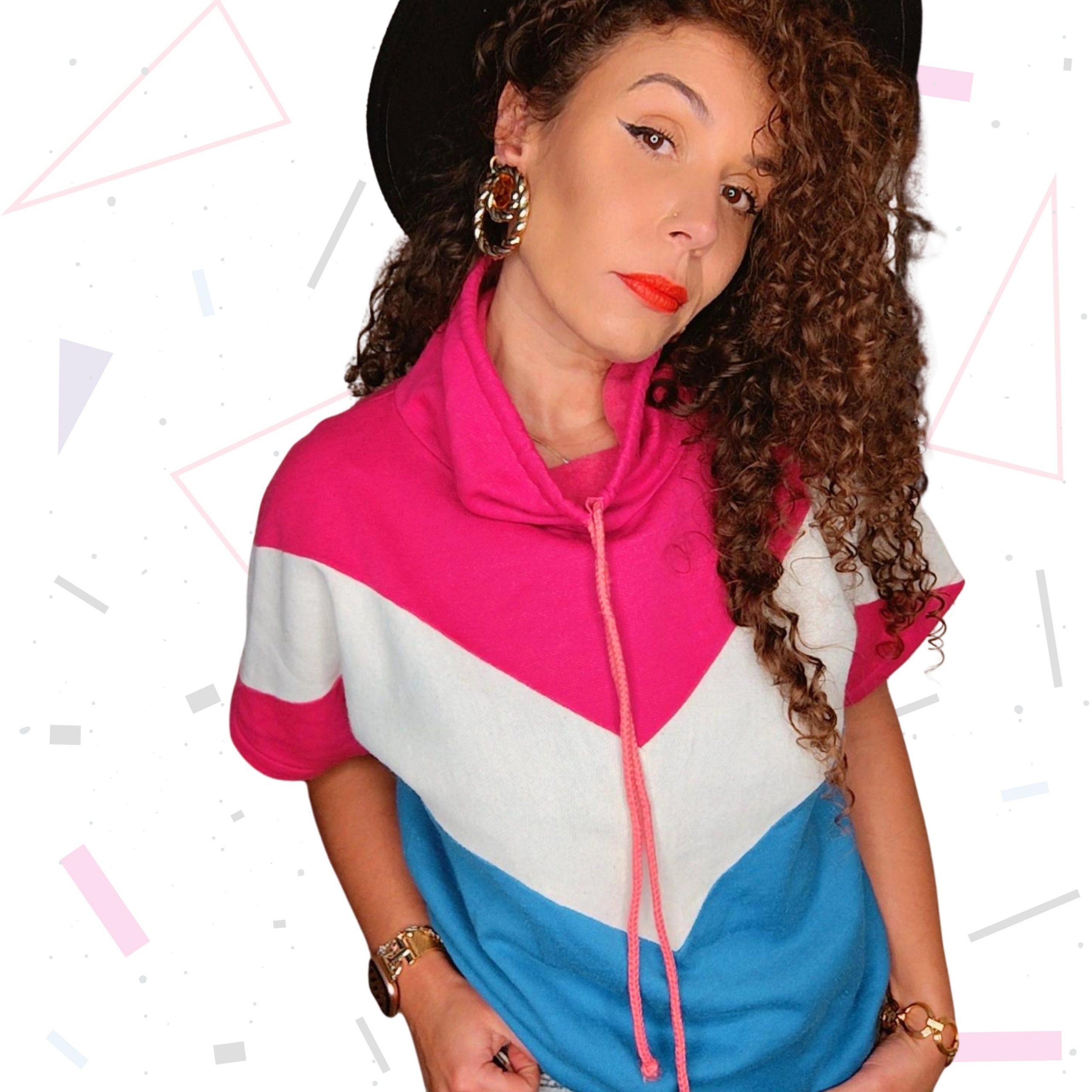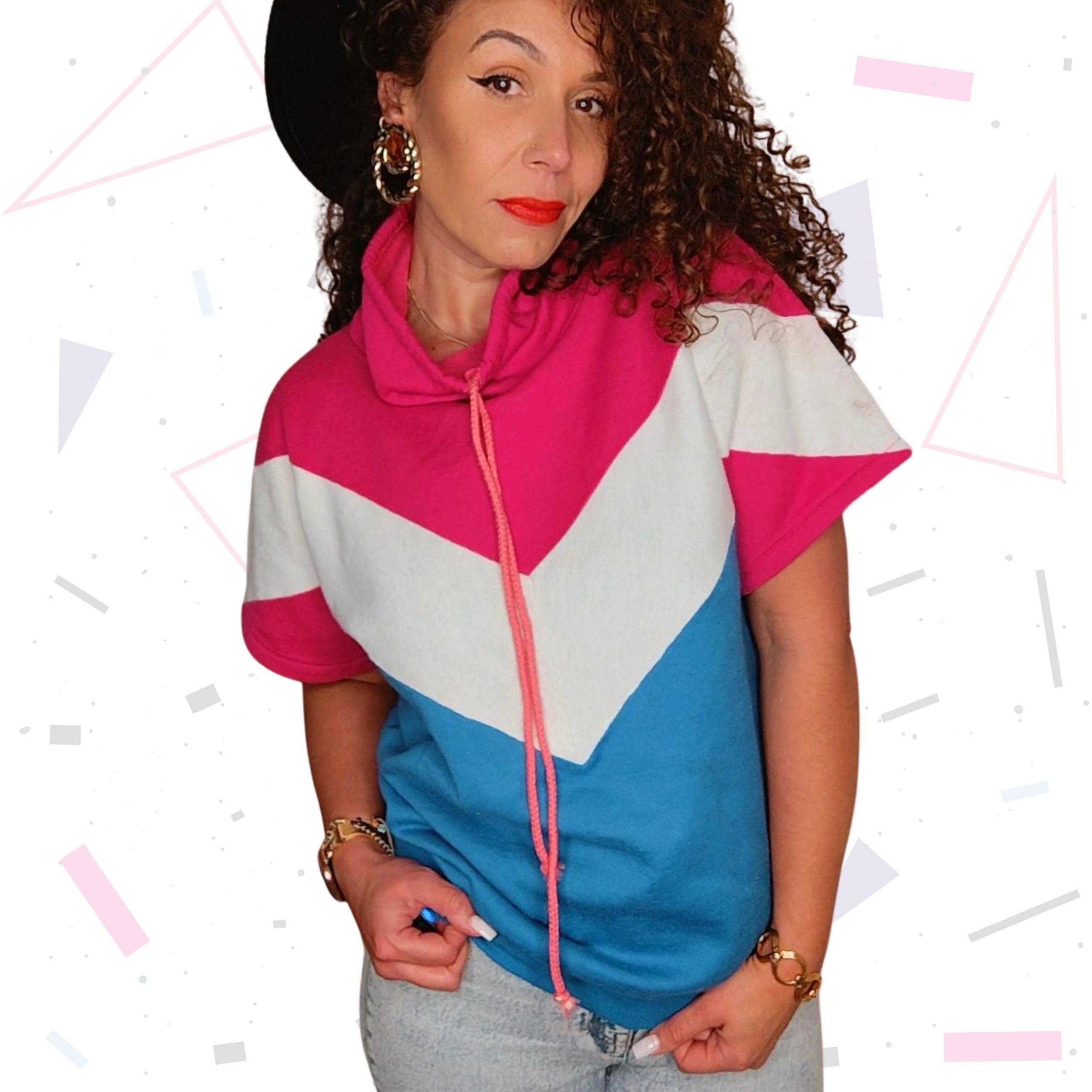 80s short sleeved sweatshirt in pink, blue and white. Drawstring high neck. Pink, white and blue.
