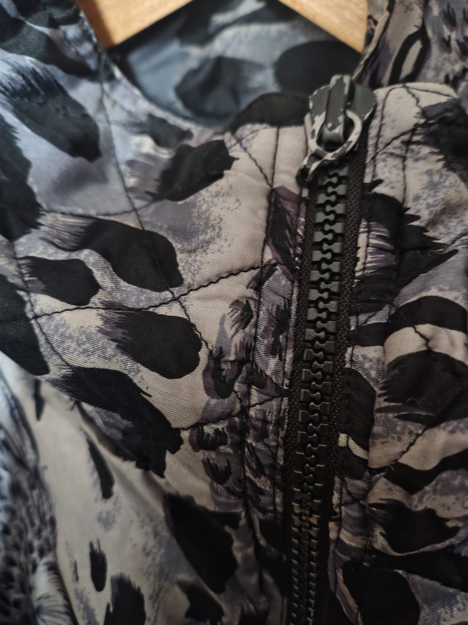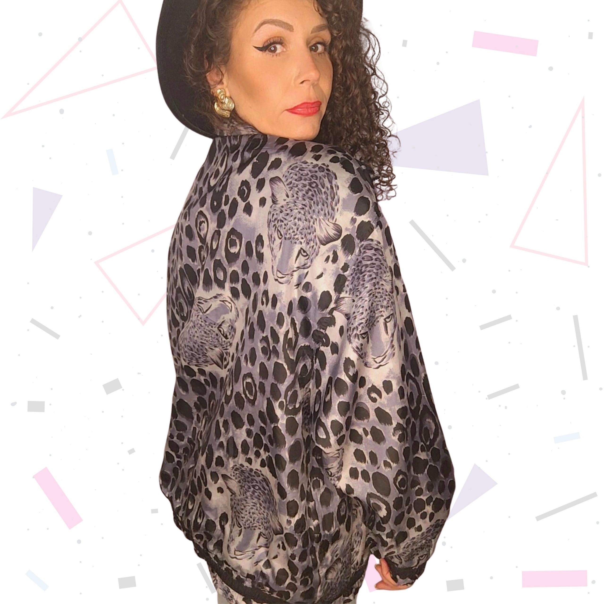80s silk animal print bomber jacket, in grey and black. Has pockets and is lined.