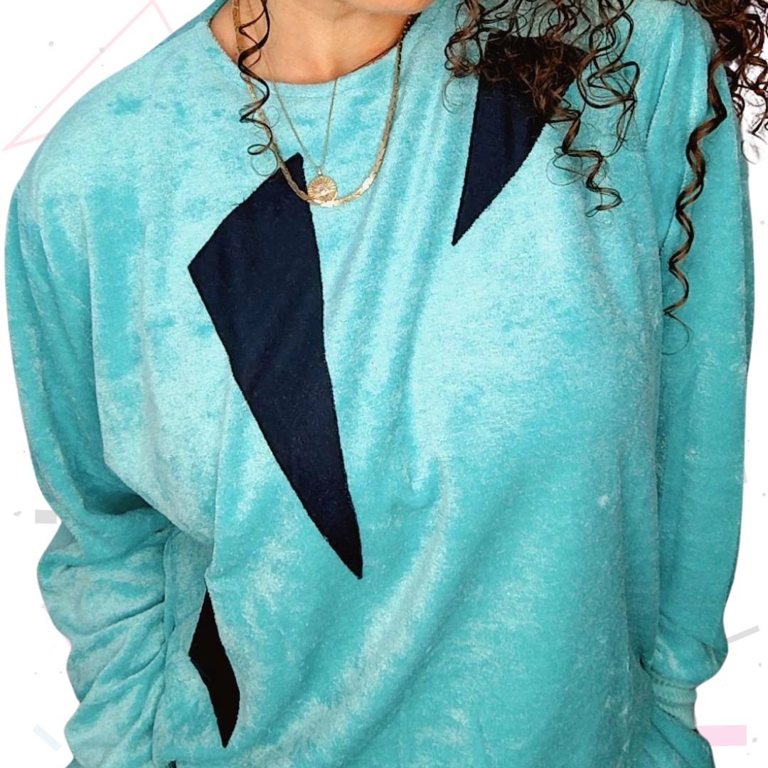 Brand new vintage. Mint green velour Loungewear set with black geometric patchwork detail. Trousers are straight leg, with pockets. Elasticated waistband.