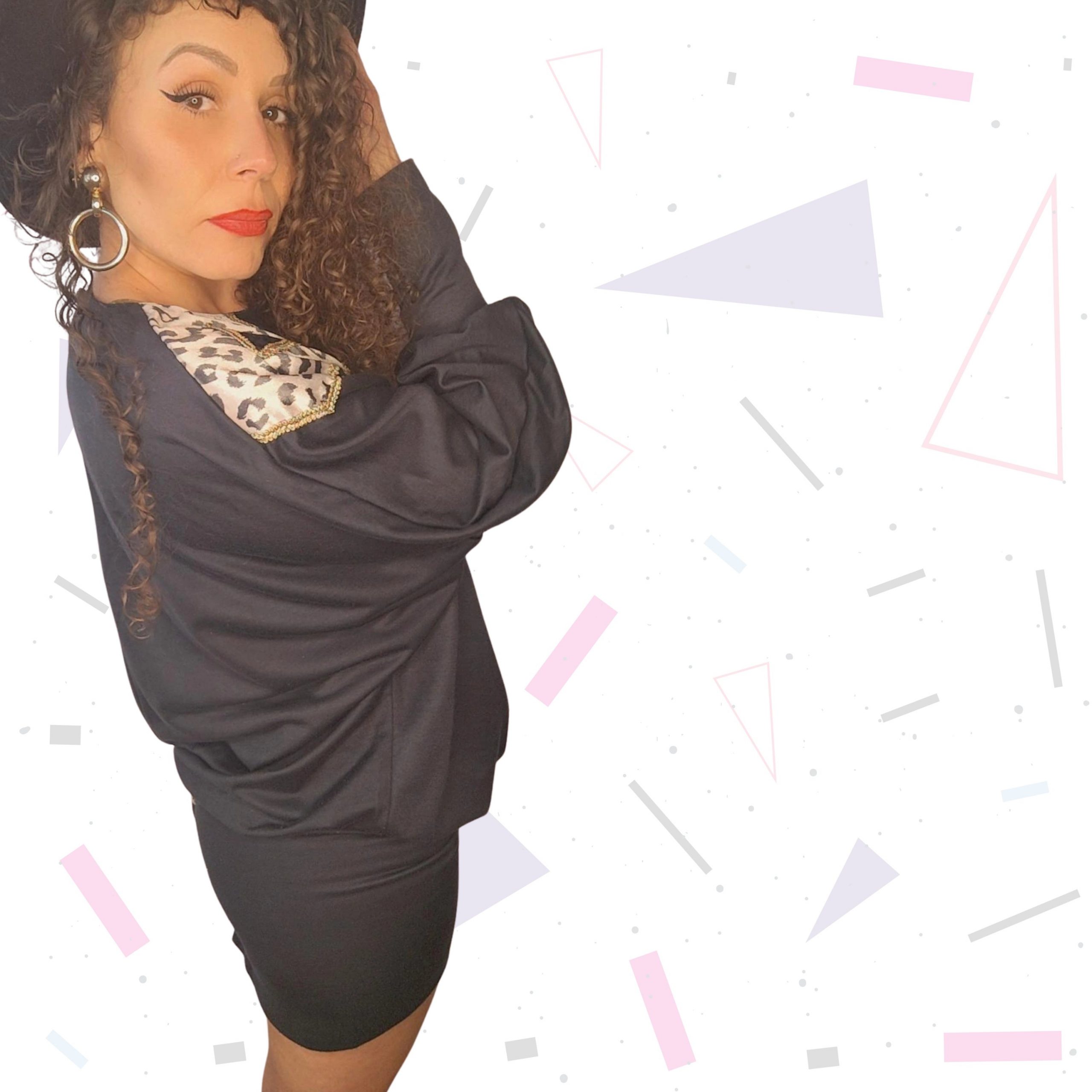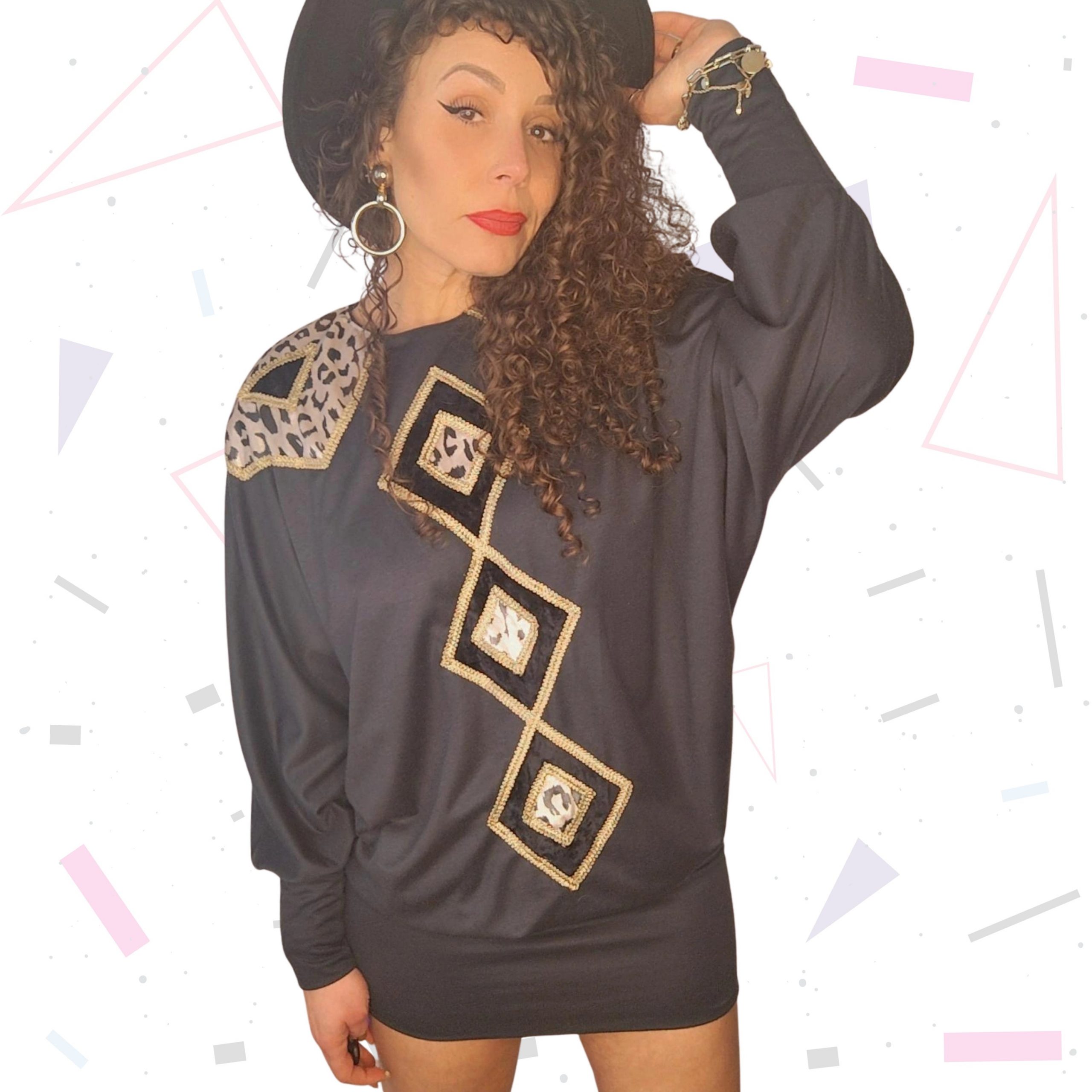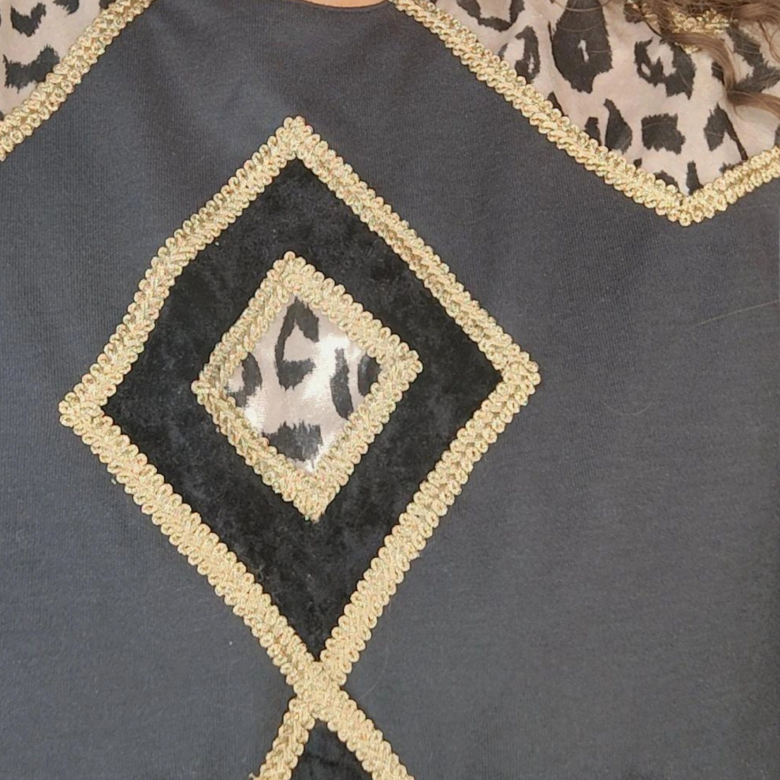 Vintage batwing style mini dress, circa 1980s. Black with velvet and animal print accents and finished with gold gimp trim. The dress has a loose fit upper/waist and is tight around the hip..