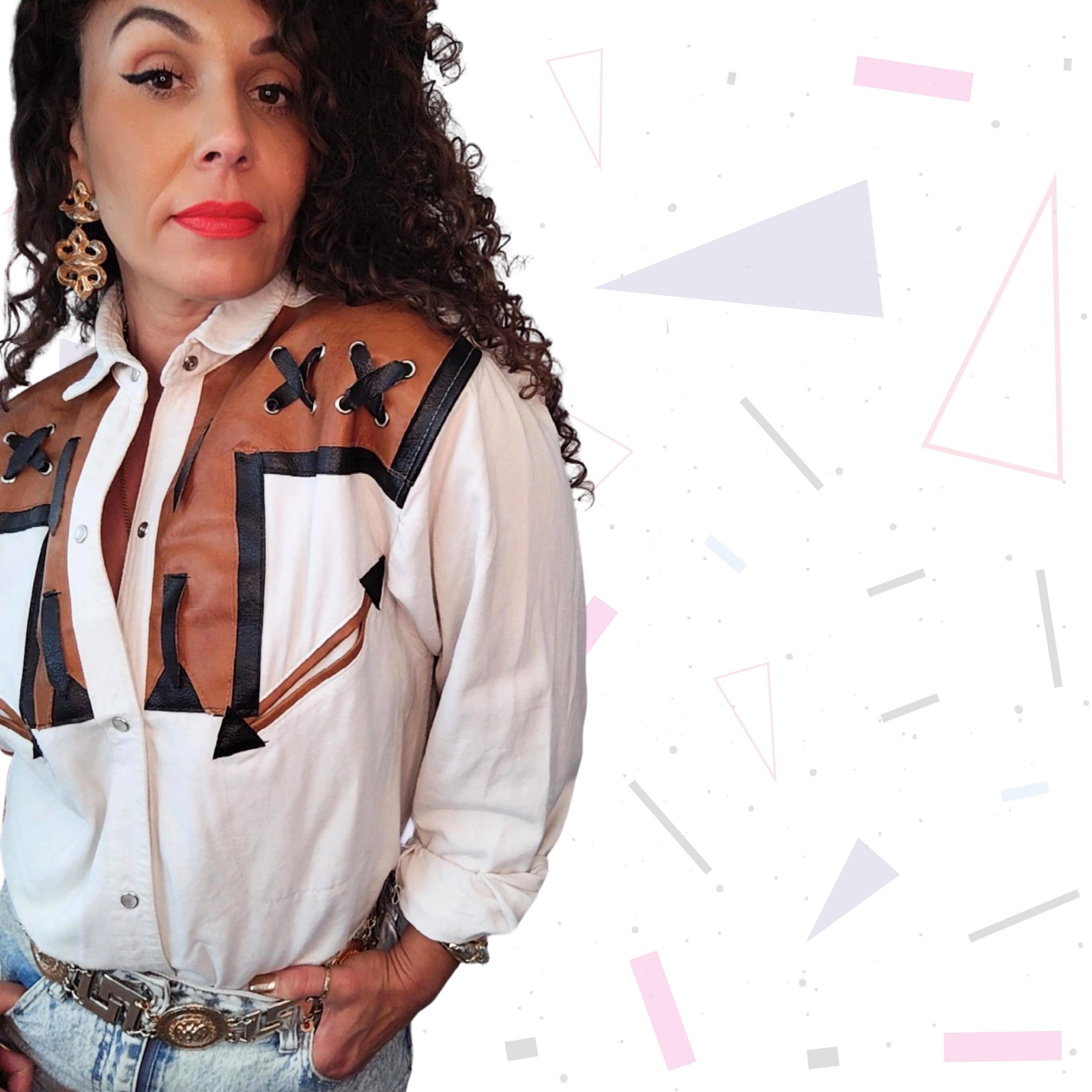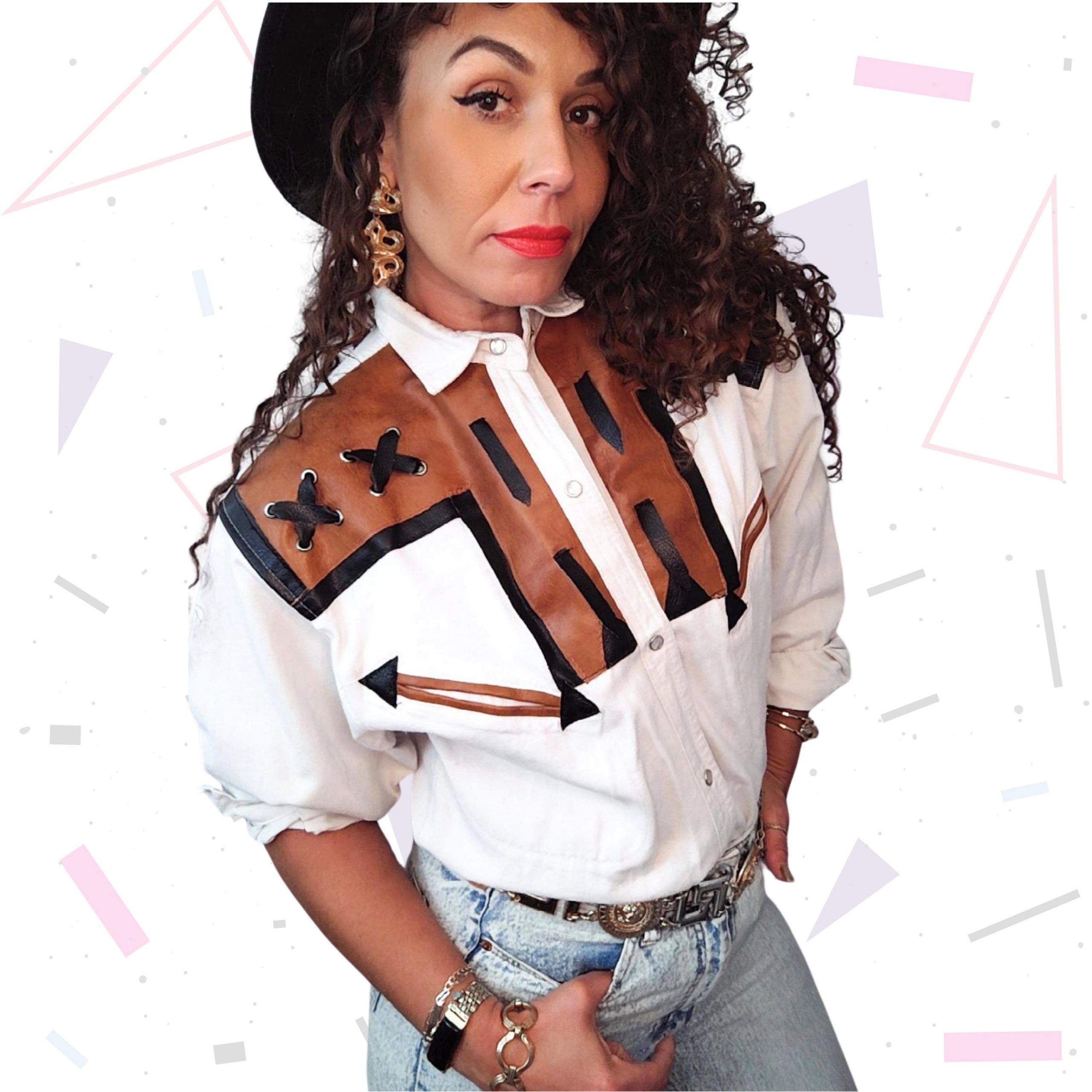 Off white thick cotton shirt with brown and black leatherette detailing to chest.
