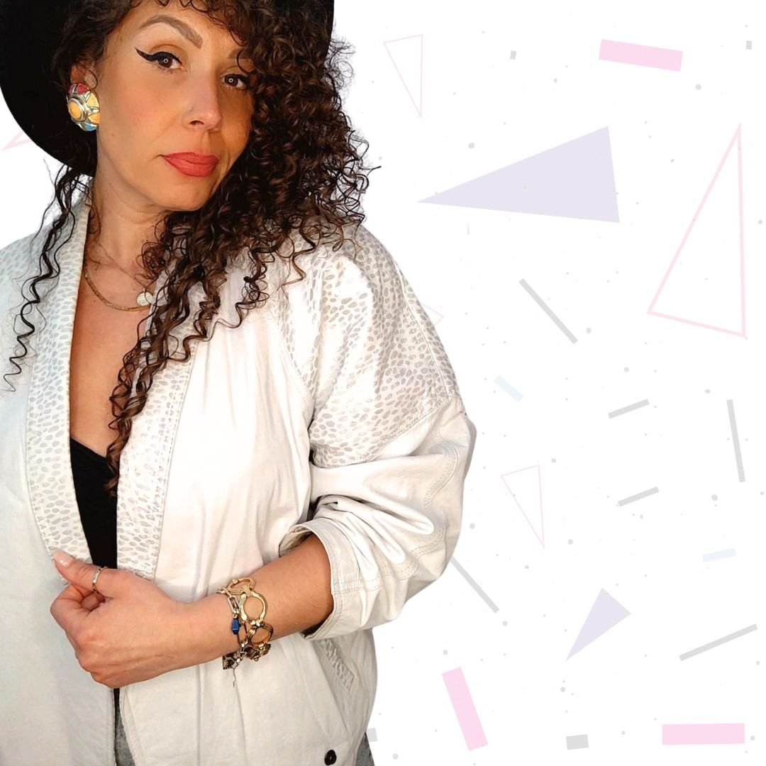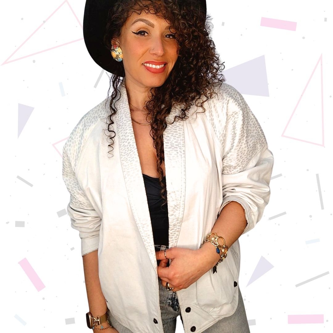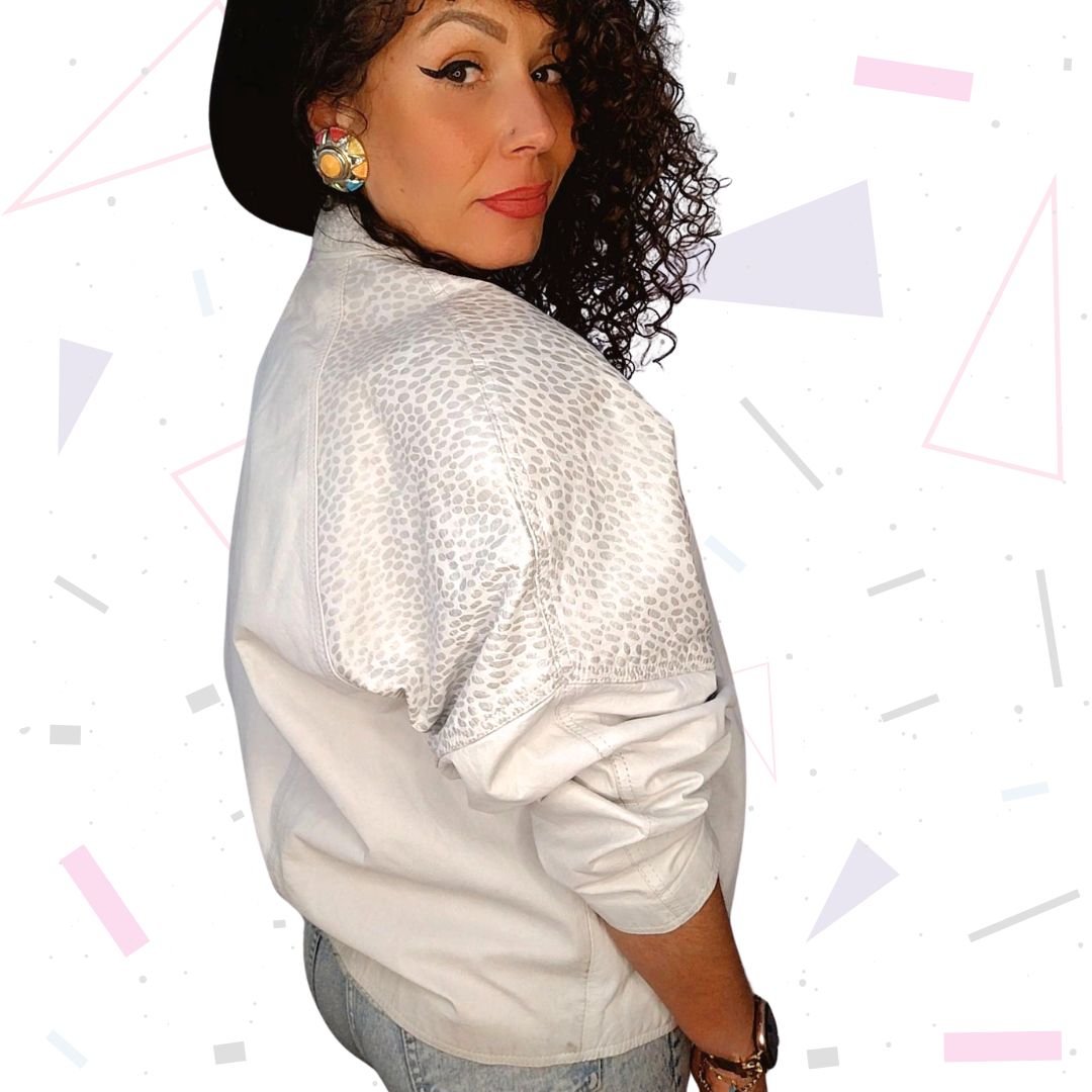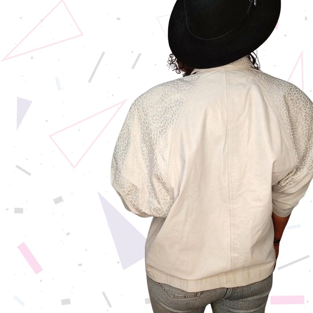Epic white leather jacket with silver metallic animal print finish. Has pockets. Really good condition for being 40 years old! The white is still very bright and overall the jacket is around 8/10 condition, with minimal wear. Fully lined and has pockets. Poppers to fasten. Batwing style sleeves.