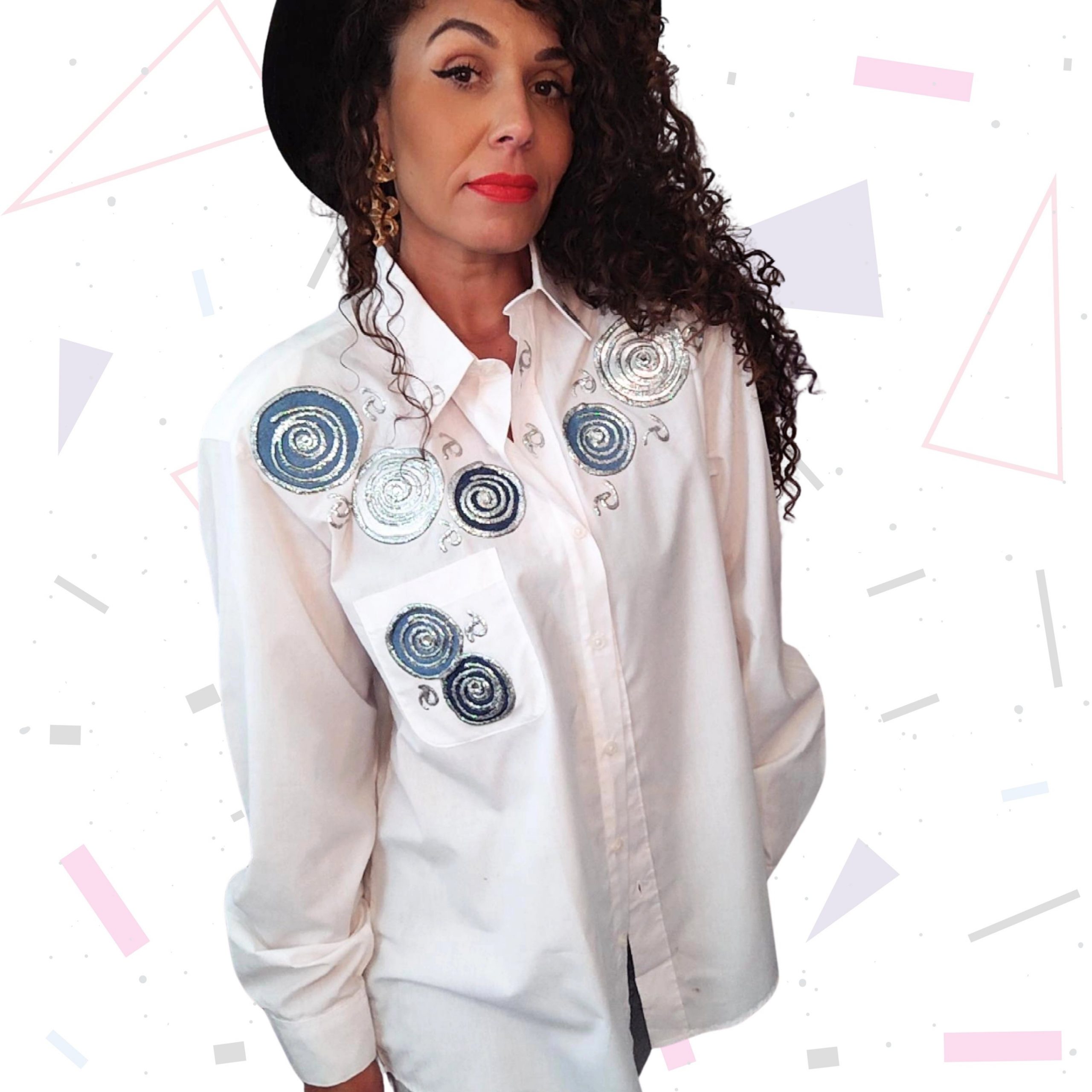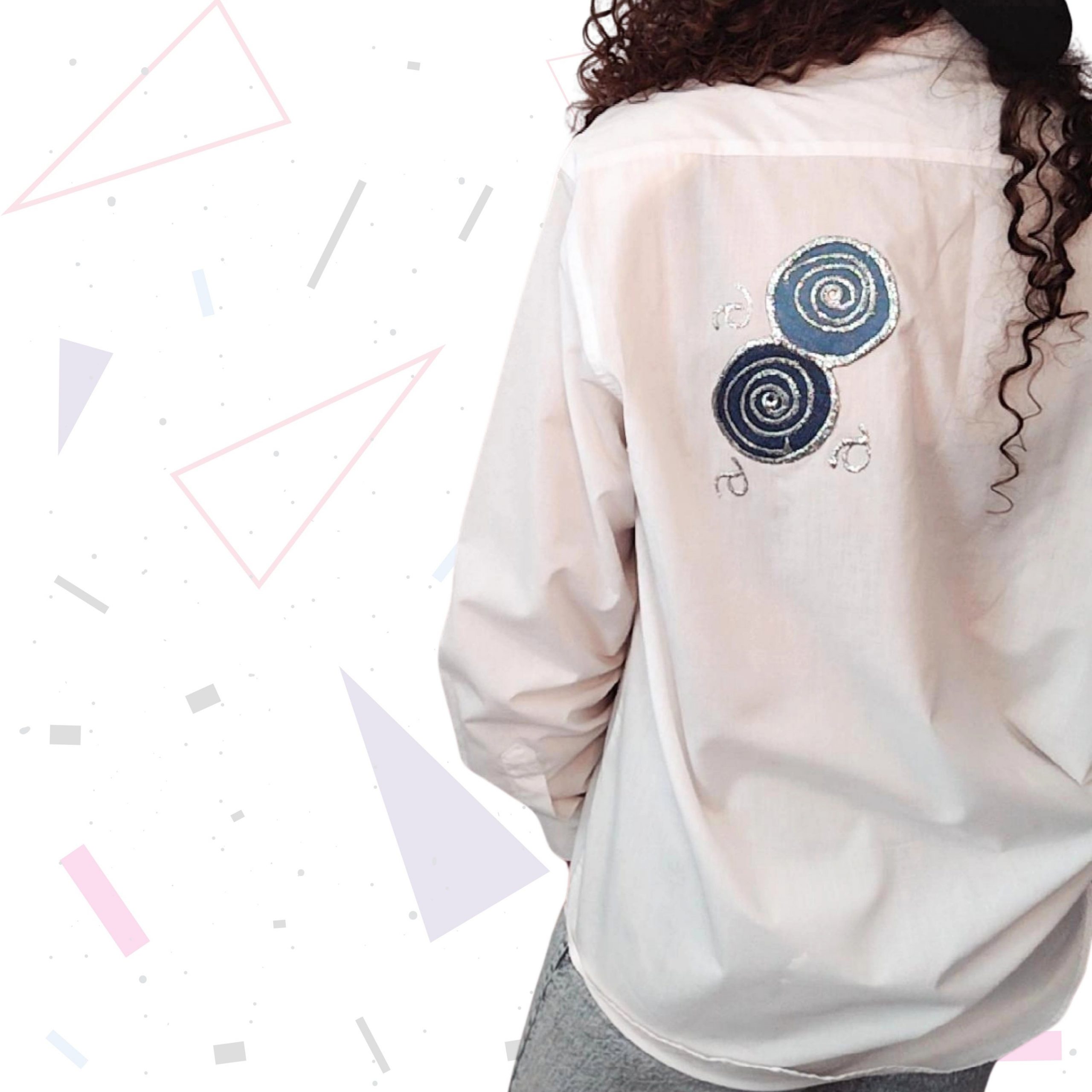White oversized shirt, with 3D blue and silver puff paint customisation.